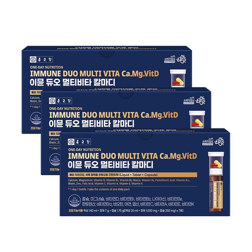 종근당 이뮨 듀오 멀티비타는 성인 남녀를 위한 종합 영양 보충제로, 다양한 비타민, 미네랄, 기타 필수 영양소를 섭취하는 데 도움이 됩니다. 7회분이 들어 있는 이 편리한 3박스에는 액상, 정제, 캡슐이 포함되어 균형 잡힌 영양 공급을 제공합니다.