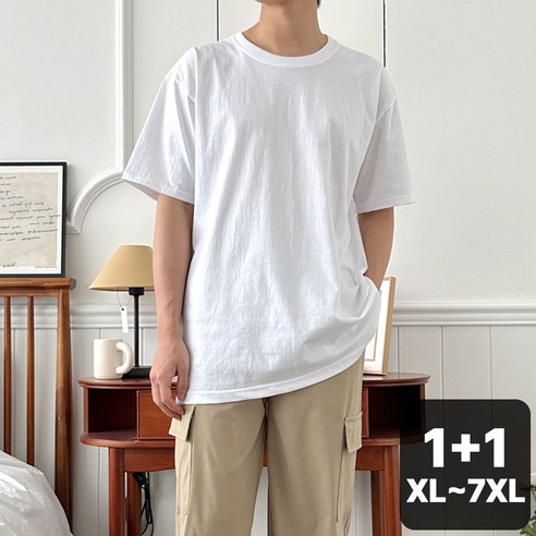 벨르모드 S-7XL 1+1 세트 국산 20수 무지 라운드 오버핏 빅사이즈 반팔 면 티 흰티 흰색 남녀공용