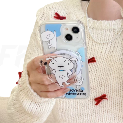 아이폰을 멋지고 기능적으로 보호할 수 있는 보호 액세서리인 CASEJ 흰둥이 짱구 초코비 맥세이프 스마트톡 클리어케이스를 소개합니다.